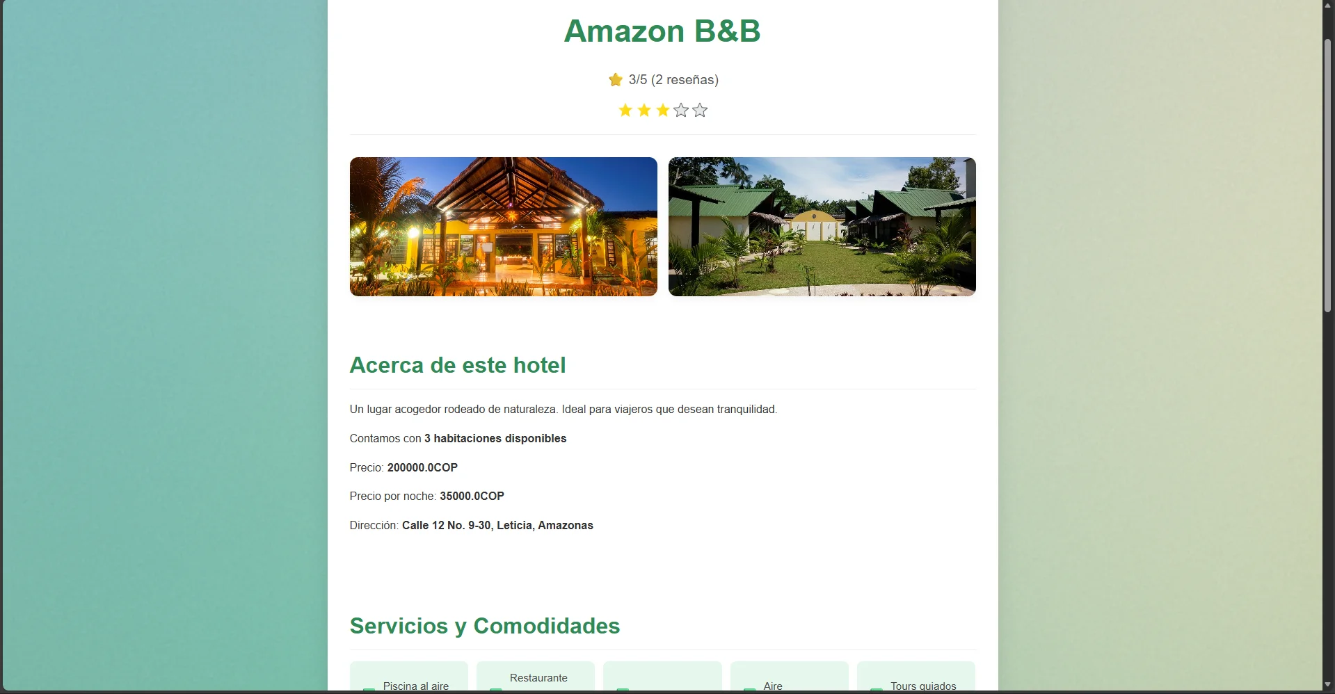 Este proyecto consiste en una propuesta de desarrollo de una plataforma web inspirada en Booking, orientada a la ciudad de Leticia-Amazonas, con el propósito de impulsar el turismo y el acceso a servicios. La plataforma permitirá a usuarios generales y empresarios explorar y publicar ofertas de hospedaje (hoteles y hostales), así como otros servicios disponibles en la ciudad. Se espera que numerosos negocios en Leticia, Amazonas, experimenten un crecimiento en sus estrategias de divulgación digital siendo esta propuesta la primera opción disponible. Con este fin, se planea ofrecer la mayor variedad posible de servicios dentro de la plataforma para alcanzar dicho objetivo.
