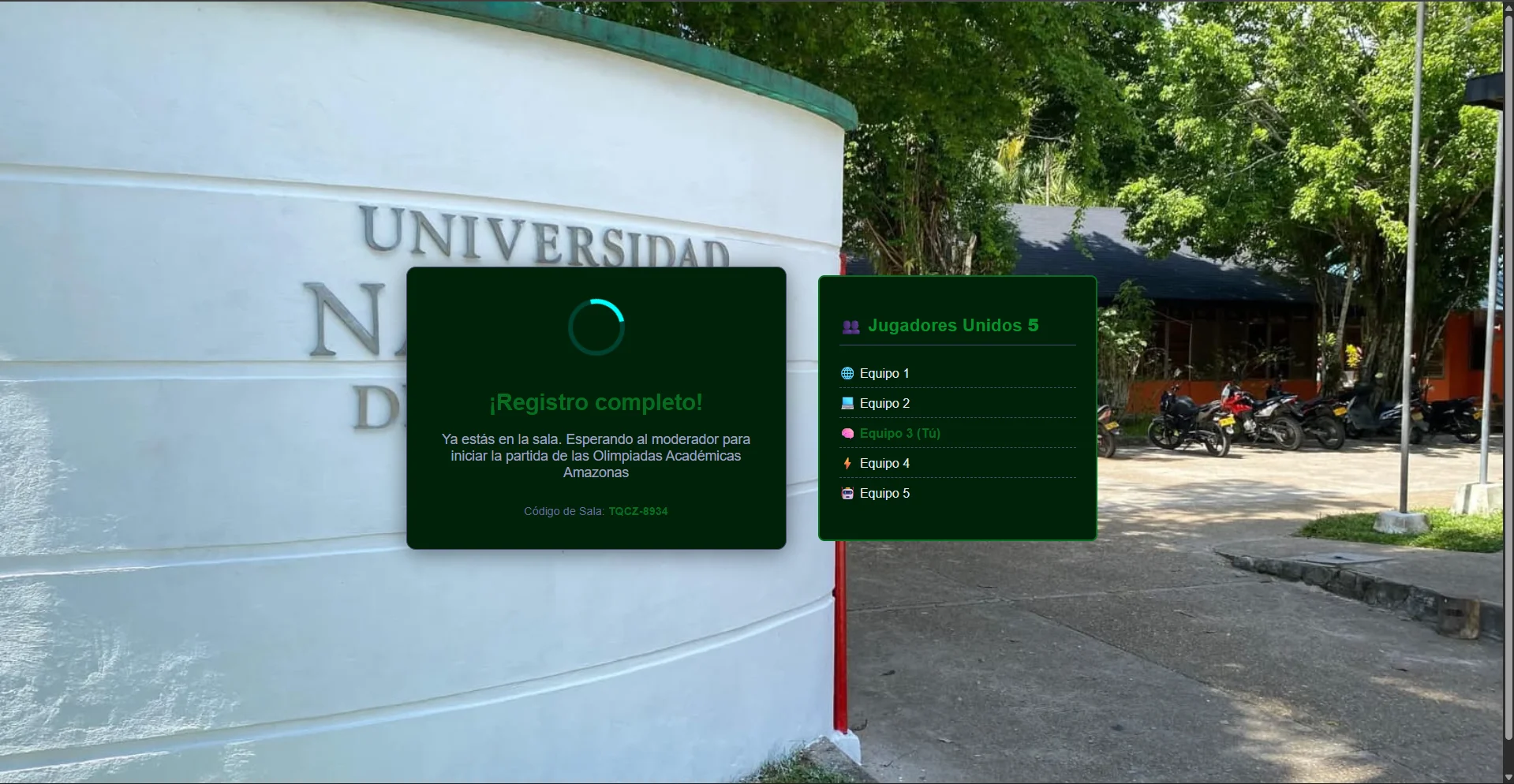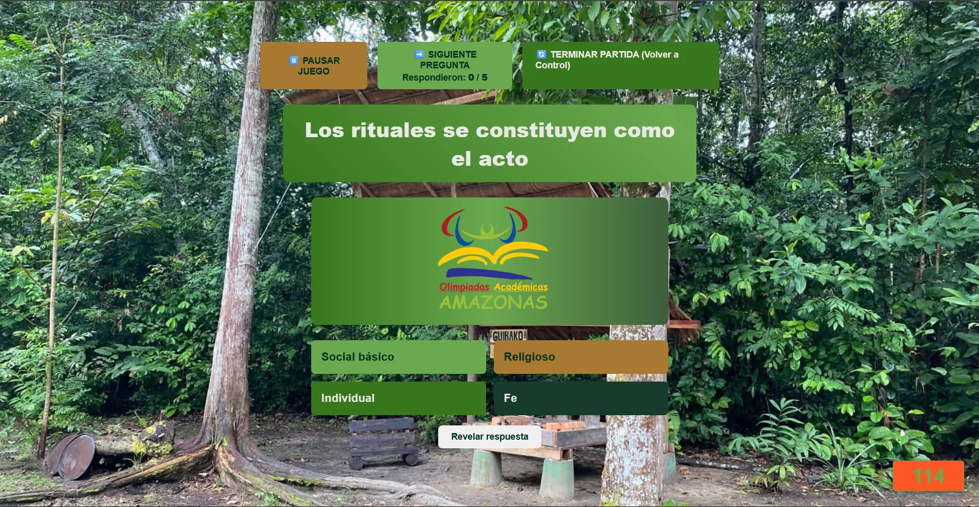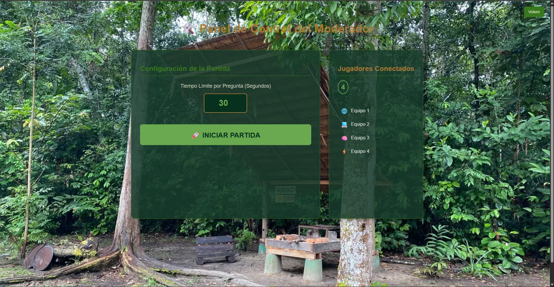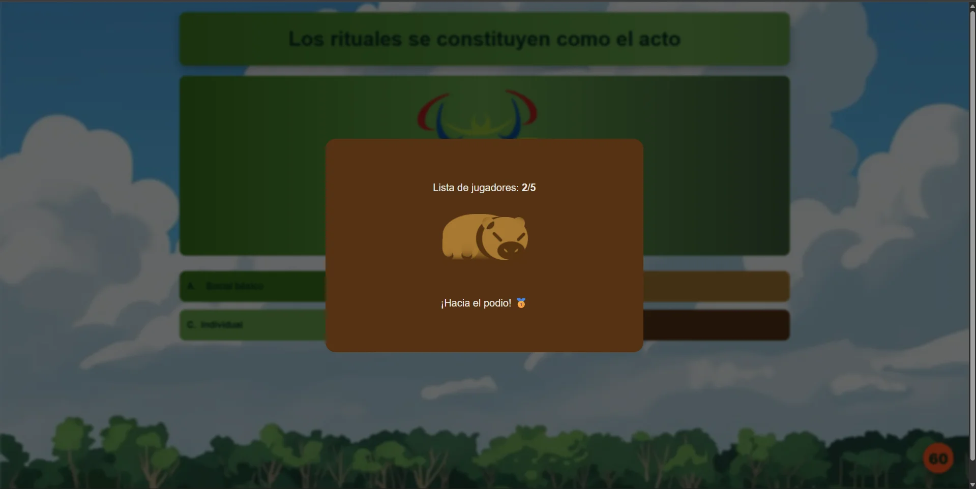 Este proyecto fue desarrollado dentro del semillero universitario denominado ForGames, en el cual nos organizamos en grupos para asumir distintas tareas necesarias para la creación del juego. En mi caso, formé parte del grupo técnico, encargado del área de programación. El juego está basado en un sistema de preguntas relacionadas con los contenidos abordados en la asignatura Contexto Amazónico. El participante que logre responder correctamente la mayor cantidad de preguntas resulta ganador. Al iniciar la partida, cada jugador puede asignarse un nombre y elegir un ícono que lo represente. El desarrollo de la partida es controlado por un moderador, quien debe autenticarse previamente mediante un código. Este moderador tiene la capacidad de iniciar y pausar el juego, mostrar la respuesta correcta de cada pregunta, visualizar cuántos jugadores han respondido y, una vez todos hayan contestado, avanzar a la siguiente pregunta. Desde la perspectiva del jugador, una vez el moderador inicia la partida, se muestra la primera pregunta junto con cuatro opciones de respuesta, de las cuales solo una es correcta. Cada pregunta cuenta con un tiempo límite para ser respondida y el juego continúa hasta llegar a la última pregunta. El sistema está programado para funcionar de manera offline y cuenta con un mecanismo de guardado de las respuestas de los jugadores, con el fin de prevenir la pérdida de información en caso de errores o imprevistos durante la ejecución del programa.