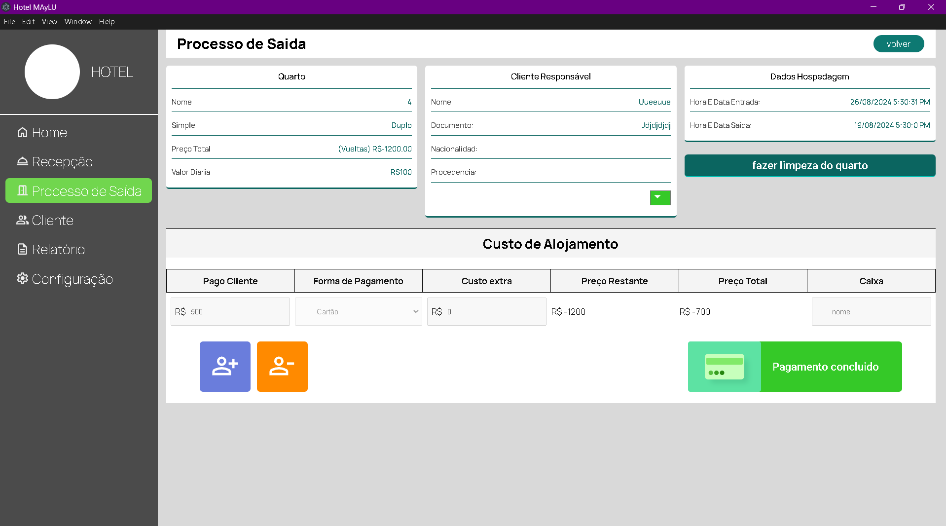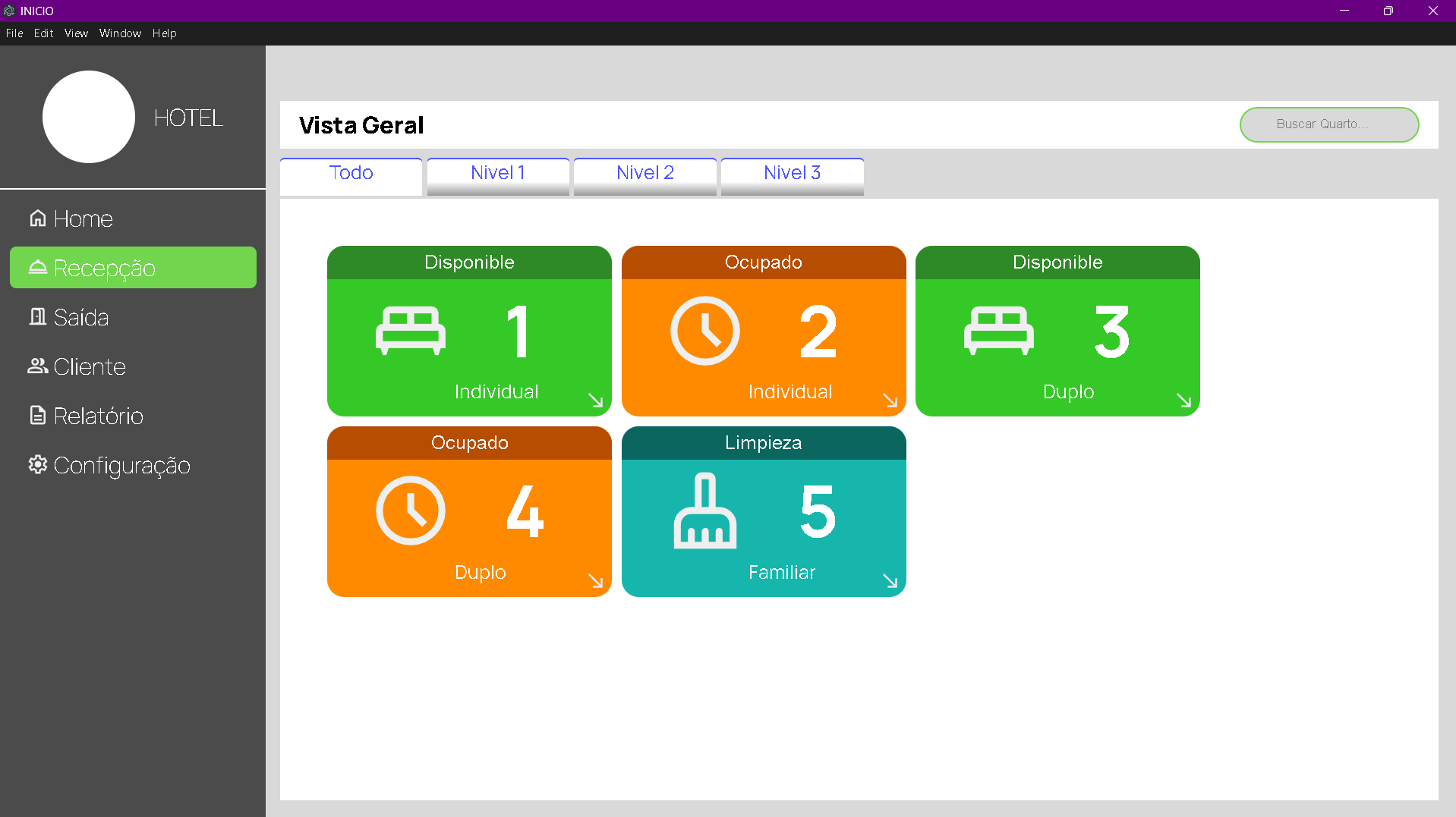 Programa de escritorio diseñado para la gestión de las entradas y salidas de los huespedes en un hotel. El programa te brinda distintas herramientas como por ejemplo: registro de huespedes en una habitación,cálculo estimado desde el día que entró hasta la fecha de salida según el valor de hospedaje, registro de pago de los huespedes, manipulación de los estados de las habitaciones, historial de registro de los huespedes ingresados en el hotel, notificación por via correo electronico cada que un huesped se registra o termina su estadía en el hotel. El programa aún está en desarrollo y lo que se busca es una alternativa que beneficie el gestionamiento de los huespedes y sus pagos, además que el programa no requiere de internet (solo para las notificaciones) y tampoco consume muchos recursos.